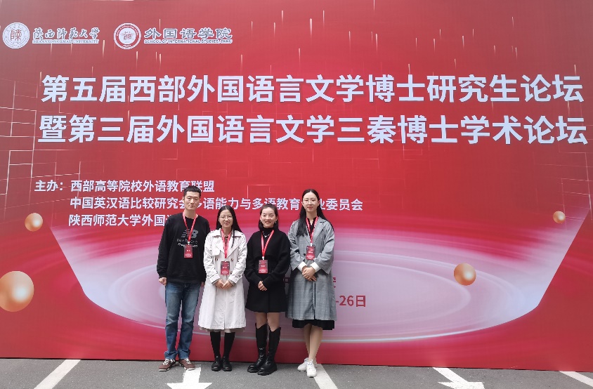 10月25日至27日,陕西师范大学举办开展“第五届西部外国语言文学博士研究生论坛暨第三届外国语言文学三秦博士学术论坛”。本次博士学术论坛通过征稿选拔,邀请了来自国内知名高校的42名优秀博士研究生,我院2023级博士研究生付强、葛玉娇、张瑜坪及2024级博士研究生秦筱婉受邀参加了此次博士学术论坛。