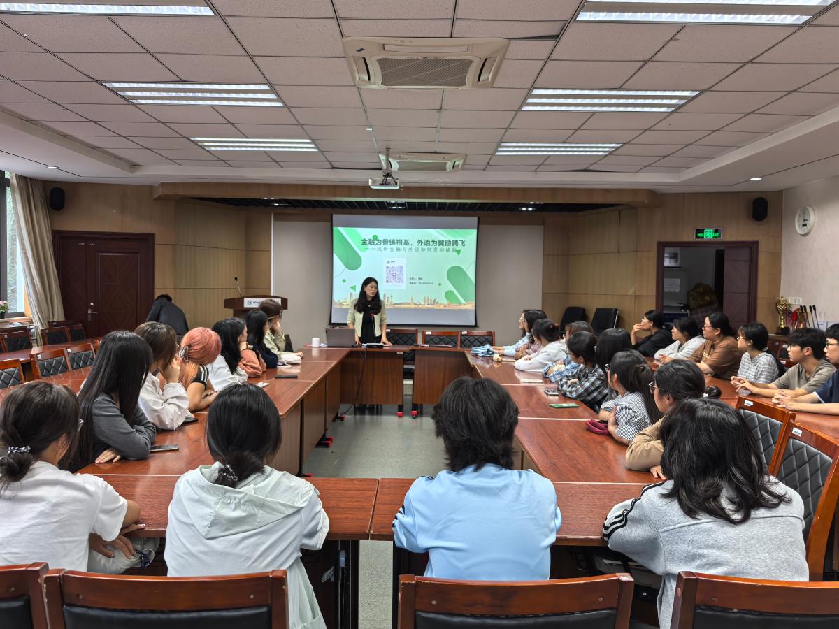 讲座中,陶红经理系统讲解了金融概念、特征及核心知识,为在场师生搭建起金融知识框架。在此基础上,她分别阐释了“外语赋能金融”与“金融赋能外语”的双向价值:外语能力助力金融从业者突破文化壁垒,搭建沟通桥梁;打破信息壁垒,拓宽国际视野;在国际金融合作、海外市场拓展中抢占先机,实现金融服务的国际化延伸。金融领域的专业术语、行业规则与法规为外语学习提供了垂直场景,让语言能力从“通用型”向“专业型”升级,如金融英语在跨境理财、国际信贷等业务中的精准应用;在经济全球化背景下,“外语+金融”的复合型人才培养早已是大势所趋。她指出,“我们只懂外语,或只懂金融,都是不行的,一定要实现‘外语+金融’1+1>2的结合”。