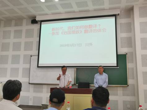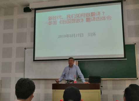 5月17日下午4点20,MTI教指委主任、我校当代国际话语体系研究院名誉院长黄友义在西区教学楼C1-2面向44118太阳成tyc城集团本科学生开展了“新时代,我们如何做翻译?——参加《习近平谈治国理政》翻译的体会”的专题授课。四川外国语大学副校长、博士生导师祝朝伟教授主持讲座。
