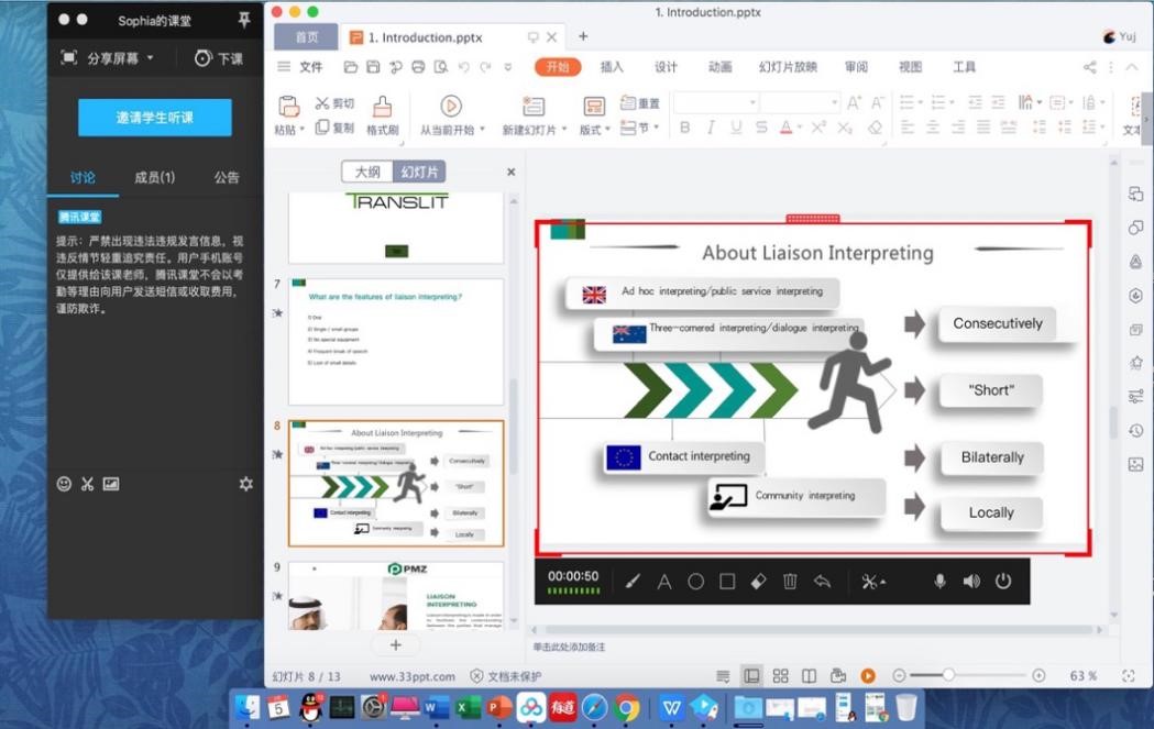 在教学平台的选择过程中,通过对比实践,我发现目前还真没有一个很完美的平台,能适合目前综合英语和联络口译课程的教学,各个平台都有很吸引人的功能,但也有很无可奈何的短板,所以综合比较最后选择了腾讯课堂和云班课作为本次在线教学的主要教学平台。