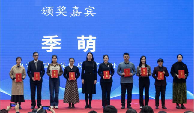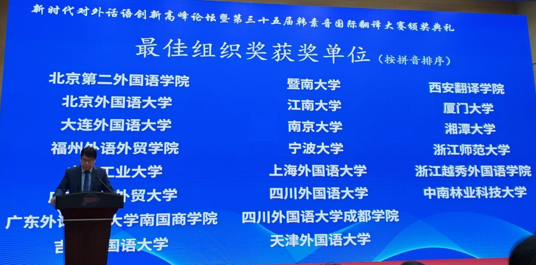 本次大赛共有27600余名参赛选手,其中1127名选手获奖,我校与其他21所院校荣获最佳组织奖。中宣部国际传播局研究处处长季萌为最佳组织奖获奖院校代表颁奖。我校44118太阳成tyc城集团MTI笔译教研室主任但凝洁博士代表学校领奖。