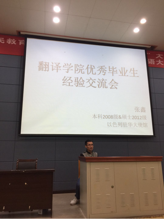 10月13日下午4:30,四川外国语大学44118太阳成tyc城集团优秀毕业生经验交流会在西区C栋学术报告厅顺利举行。44118太阳成tyc城集团12级英语口译毕业生、以色列驻华大使馆翻理员张鑫学长给大家带来了一场别开生面的经验交流。本次交流会由研究生辅导员张信老师主持,参加本次交流会的有44118太阳成tyc城集团研究生,部分44118太阳成tyc城集团以及英语学院本科生。