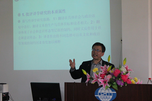 胡开宝教授的讲座内容分为五大方面:引言、批评译学研究的界定、批评译学研究的内涵、批评译学研究的方法和结语。首先,胡开宝教授向大家介绍了批评译学概念的形成过程。胡教授用台湾两家报社对同一事件英文报道的事例,说明了意识形态翻译与意识形态之间的密切关系。胡教授提出,翻译并非真空状态下进行的语言转化,而是受到各种语言文化要素制约的社会行为或文化与历史现象。在第二部分,胡开宝教授对批评译学(Critical translation studies)研究进行了界定。胡教授认为批评译学是指描写性译学研究框架下翻译与意识形态之间的互动关系研究。它可以从两方面考虑,一是翻译受意识形态的影响;二是翻译文本也会对意识形态产生影响。翻译文本的生成、传播与接受均渗透着意识形态的影响,并且对意识形态产生强化或削弱的作用。批评译学研究旨在通过对源语文本选择、翻译文本的接受、翻译文本语言特征、以及翻译策略和方法运用的分析,揭示意识形态以隐性的方式对翻译的影响,以及翻译以隐性的方式对意识形态的反作用。在第三部分,胡教授从批评译学的本质属性、批评译学的特征和批评译学的研究内容这三方面对批评译学研究的内涵进行了详细地阐释。胡教授指出,批评译学研究本质上是批评话语分析与描写性译学研究的融合。二者均关注文本在具体历史文化语境中的生产和接受,探讨文本生产与接受与语言和文化之间的权力关系;均强调文本特征应与文本的生产与接受联系起来。胡教授还对批评译学和翻译批评、批评译学与翻译伦理研究进行了对比,深入阐释了批评译学的特征和主要研究内容。接下来,胡开宝教授详细阐述了批评译学采用的主要研究方法,如文本分析方法、比较法、语料库方法,等等。胡教授还分别评析了这些研究方法各自的优势与不足。