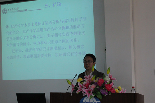 最后,胡教授总结道:批评译学本质上是批评话语分析与描写性译学研究的结合。批评译学运用批评话语分析和功能语言学所采用的文本分析方法,揭示翻译实践或翻译文本所蕴含的翻译、权力和意识形态之间的关系。近年来,批评译学研究才刚刚起步,相关概念亟需厘清,理论框架需要建构,实证研究有待开展。