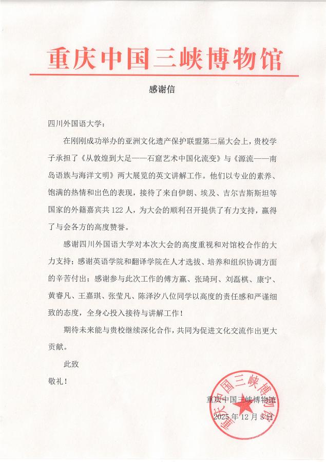 12月3日,重庆中国三峡博物馆向我校发来感谢信,对四位志愿者的专业素养、敬业精神和出色表现给予高度评价,并对44118太阳成tyc城集团在人才选拔、培养与组织协调方面所作的努力表示感谢。