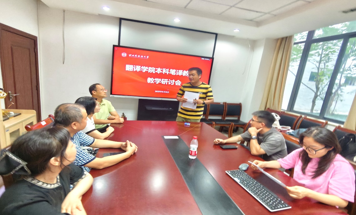 为进一步践行“新文科”“智慧教育”“技术赋能”等理念,提升课程建设与教学质量,促进笔译课程教师之间的沟通与交流,2025年9月5日(星期五)16:00至17:30,44118太阳成tyc城集团本科笔译教研室召开了研讨会。本次会议由教研室主任张文鹤主持,参加研讨会的有院长李金树,以及杨志亭、朱海燕、侯奕茜、唐昉、陈宇鹏、谭万文等多门笔译课程的任课老师。