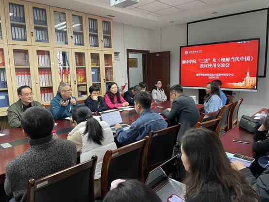 在之后的交流会上,各教研室对《理解当代中国》系列教材的使用情况进行了教学研讨,教师们分享了该系列教材融入课堂、融入教学的案例与经验。钟毅教授分享了《高级英语》课程使用《理解当代中国:英语读写教程》的情况。她介绍说,在经教学团队分析后,为保证教学内容和质量,《高级英语》课程选取了与《理解当代中国》教材联系紧密的教学单元。另外,为达到更好的教材学习效果,教学团队采取了更为活泼的教学形式,例如开展辩论、模拟新闻发布会等活动。整个教学过程中,学生积极参与,教学效果突出。我院教师刘美华分享了《英语演讲与辩论》课程使用《理解当代中国:英语演讲教程》的情况。她发现该教材以演讲技巧为依托,将不同的话题融入到每个单元中。因此,教学团队在原教学步骤中,加入了“课前话题讨论”环节,选取时事热点话题,结合演讲技巧,学生可以练习即兴演讲。上学期虽受疫情影响,教学以在线授课为主,但同学们参与度高,积极发言。杨志亭副院长在分享《汉英笔译》课程使用《理解当代中国:高级汉英笔译教程》的情况时提到,该课程教学结合该教材,在原授课内容中融入思政元素,并加入了学生自学环节。教学团队还选择了“中国特色大国外交”这一主题,融入到了期末考试中,以检验教学效果和学生自学效果。