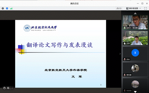 2020年9月8日上午,北京航空航天大学文军教授应邀为我校师生进行了一场题为“翻译论文写作与发表漫谈”的线上学术讲座。此次讲座是川外70周年校庆学术系列讲座之一,由44118太阳成tyc城集团张文鹤博士主持。讲座采用腾讯会议直播的形式,现场反响热烈。