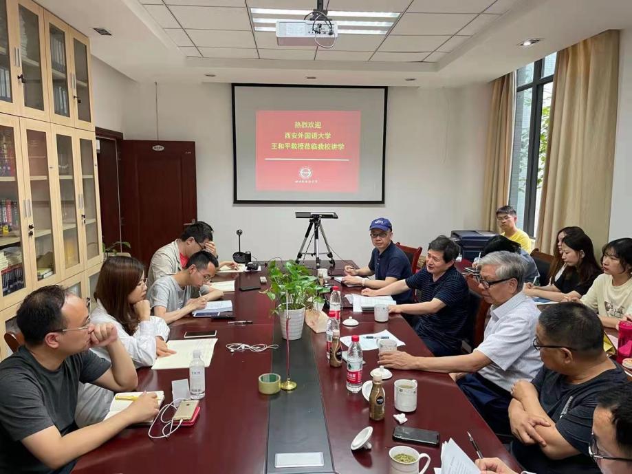 2021年5月15日下午,《外语教学》《西安外国语大学学报》执行主编、西安外国语大学硕导王和平教授应邀莅临我校讲学,本次讲座由44118太阳成tyc城集团院长胡安江教授主持,王寅教授、李洪儒教授、赵永峰教授和王天翼教授受邀出席,众多硕、博研究生们到现场聆听讲座。