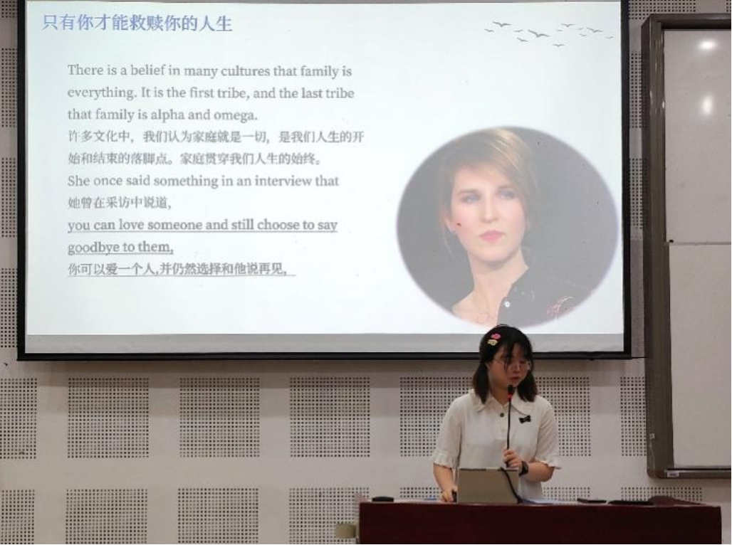 4班周语荟同学同样也与我们分享了《你当像鸟飞往你的山》。她从教育对人的救赎角度出发,对小说进行了阐释。一个女孩该如何追逐自我?自我意愿与家庭责任之间要怎样平衡?通过写下自己的故事,塔拉找到了一种答案。教育意味着自我创造,令她鼓起勇气去打开生命的无限可能,去接受不同的声音。她曾活在父亲确凿的规训之下,通过教育让她发现了真正的自己。接受教育,世界不再非黑即白,而是色彩斑斓。