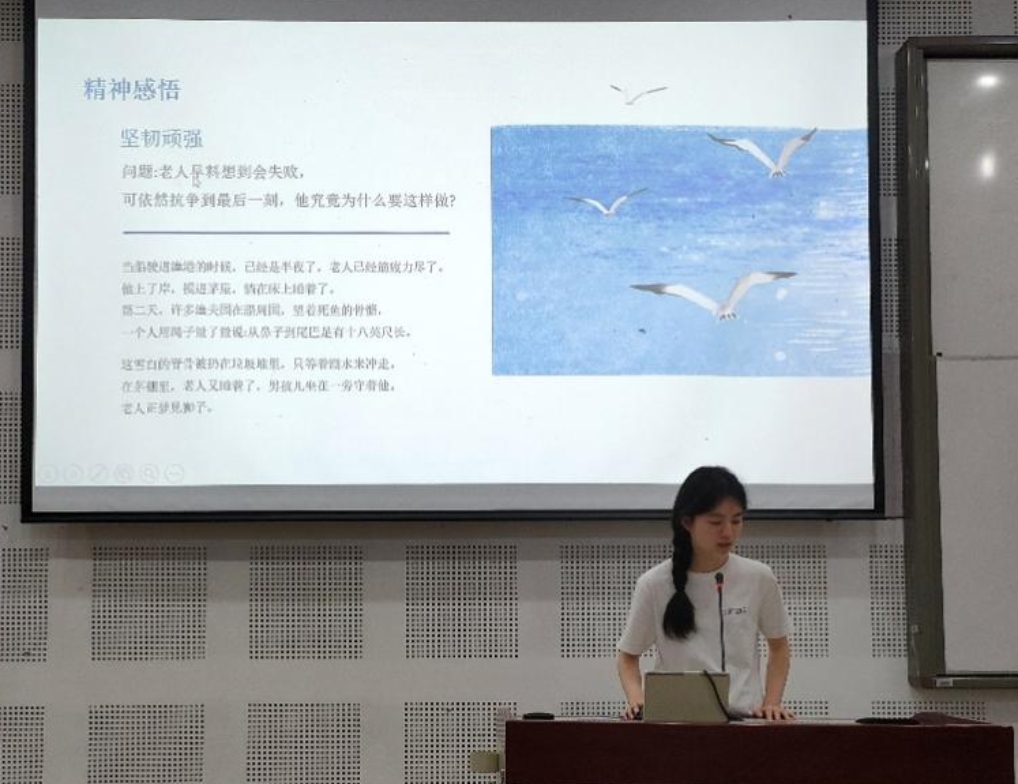 2班文倩同学与我们分享了海明威的《老人与海》。在肉体上,老人被无数次地打垮、击倒,但在精神上,圣地亚哥却是位永不落败的枭雄。正如书中谈到“一个人并不是生来要给打败的,你尽可以的消灭他,可就是打不败他。年迈的老渔夫圣地亚哥在无数次困境中,始终怀着永不服输的斗士精神和积极向上的人生态度,一次又一次克,焕发出坚毅顽强的人性光辉,诠释了生命的真谛。