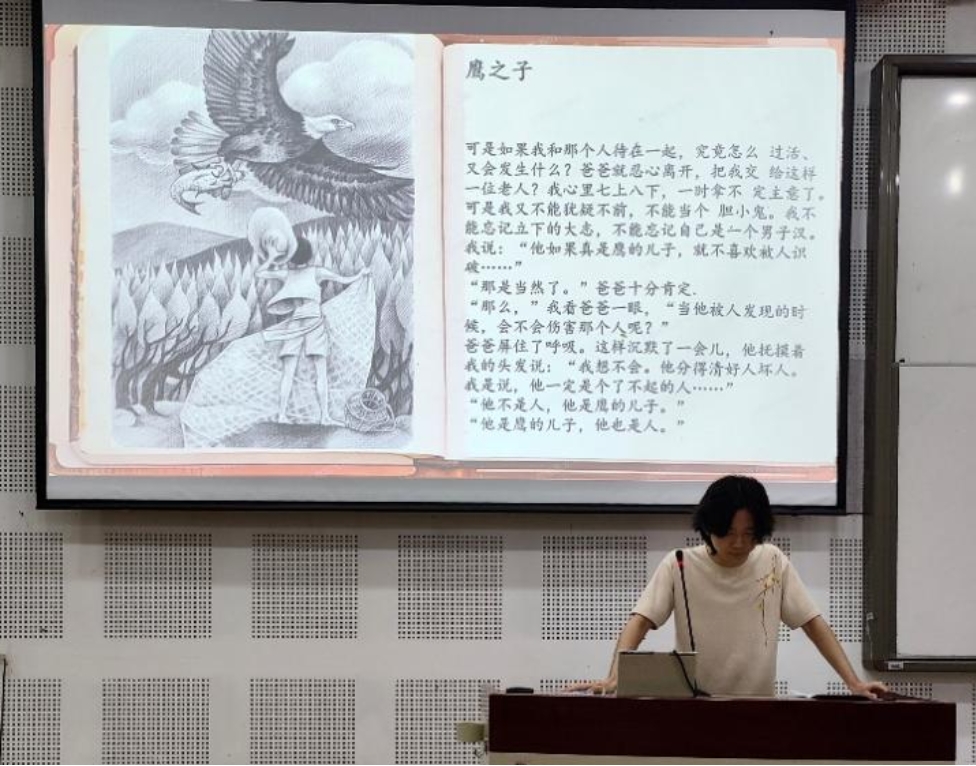3班王亚熙同学为我们带来作家张炜的代表作品——《寻找鱼王》,正直和纯真的精神追求贯穿小说始终。在干旱缺水的大山深处,鱼成为一种稀有而奢侈的食物,捉鱼和吃鱼则象征着不同寻常的本领和身份。一个八岁的孩子在父亲的陪伴下苦苦寻找“鱼王”学艺,历尽艰辛终于找到了传说中的老鱼王。少年在寻找的过程中也逐渐找到了自我和真心,放下想要成为鱼王的执念,成为一个守护大鱼而非征服大鱼的人,学会敬畏自然、保护自然。