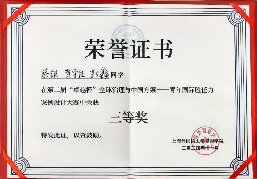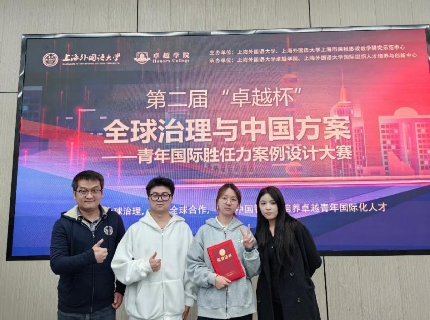 11月24日,第二届“卓越杯”全球治理与中国方案——青年国际胜任力案例设计大赛在上海外国语大学举行。 大赛旨在促进全球合作,挖掘与培养卓越青年国际化人才。本次大赛由上海外国语大学及上海市课程思政教学研究示范中心主办,上外卓越学院、国际组织人才培养与创新中心承办,吸引了来自全国14所高校的22组队伍入围。比赛议题紧扣当下热点,涵盖地区发展、脱贫可持续、文化遗产保护等诸多领域,考验选手外语表达、跨文化议题分析及协商行动能力。我院2024级本科生蔡银、贺宇佳、郭鑫三名同学组成的团队在张文鹤老师地指导下,在比赛中表现出色,获得大赛三等奖。