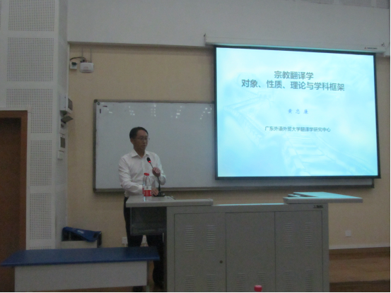 黄教授将讲座分为六个部分:前言、宗教翻译学的对象、宗教翻译学的性质、宗教翻译学的理论体系、宗教翻译学的学科框架和结论。其中,黄教授从翻译所涉要素和宗教作品两个角度分析了宗教翻译学可能涉及的对象,并进一步指出宗教翻译学独特的主要对象,即阐明宗教翻译的规律、探讨宗教翻译与其它领域的关系以及探讨宗教与翻译的关系。接着黄教授从学科内部和学科外部两个视角出发,阐明了宗教翻译学的多重学科性质。随后,黄教授着眼于本体理论和关系理论两个板块,详细介绍了宗教学的理论体系以及与之相对应的学科框架。最后,黄教授与大家分享了就此研究所得出的结论。