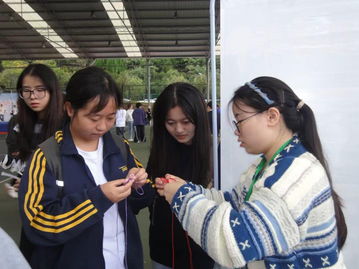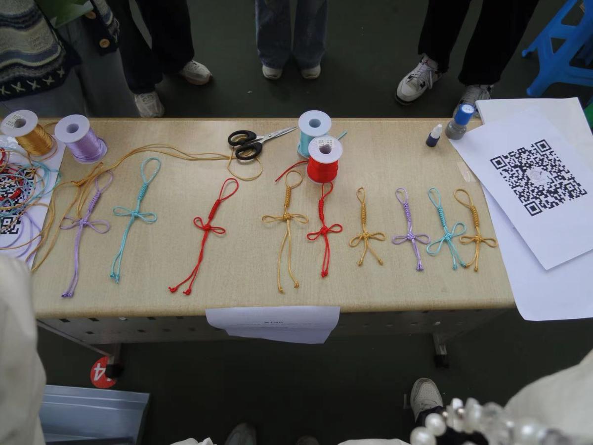 其次是“结缘四海”——巧手编中国结体验区。这是整个展位最富诗意的角落。翻译协会的成员们化身“文化使者”,耐心教导过往的同学编织简易的中国结。一根根红绳在指尖穿梭缠绕,寓意着吉祥、团结。协会会长赵新雷解释道:“‘结’在中国文化中代表联结与美好。我们希望通过这个活动,让大家亲手‘编织’一份对中国传统文化的理解,这也是我们身为语言学习者,投身中西文化交流、推动文明互鉴的初心与使命。。”