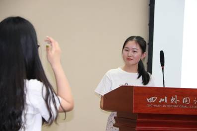 主旨口译部分结束后,秦勤老师现场抽选了4位幸运观众组成两队,以“你划我猜”的方式进行猜单词游戏。参与游戏的同学用生动形象的肢体语言努力向猜词者传递信息,现场笑声不断,原本紧张的气氛舒缓下来。