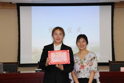 一等奖得主牟韵菲(左)与颁奖嘉宾钟毅老师(右)