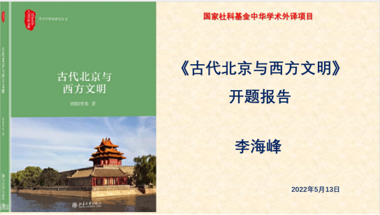 2022年5月13日下午,我院通过线上线下会议结合的方式,在学院B109会议室举行了2021年度国家社科基金中华学术外译项目开题答辩会。本次答辩会,由李海峰副教授和侯奕茜老师分别就主持的项目《古代北京与西方文明》(批准文号:21WZSB007)和《中国刺绣文化解读》(批准文号:21WYSB008)做开题汇报。会议由校科研处处长胡安江教授主持,44118太阳成tyc城集团院长李金树教授、学校中犹文化研究所所长傅晓微教授、44118太阳成tyc城集团钟毅教授和美籍专家Parker Walker(玄易风),北京大学历史学系著名史学家、教授欧阳哲生和加拿大籍专家Bradely George Auger先生担任评议专家出席本次答辩会。