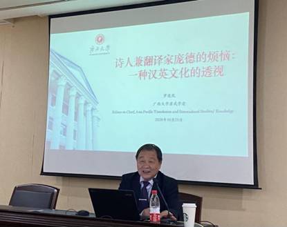 罗教授的讲座从“庞德的烦恼来自何处”这一问题展开,首先罗教授分享了自己的观点,认为庞德的烦恼“来自中国学者文化自觉的阙如”,并逐一列举和分析了三个有关“烦恼”的案例,其中包括诗歌创作《在地铁站的出口》,诗歌翻译《长干行》片段和经典翻译《论语》的评价。采用跨学科的研究视角,罗教授指出当下我国学者对于庞德这一伟大的诗人和翻译家的评价和研究,存在三种表征为“文化中心主义”的误区:自言自语,不顾及对方的存在;慷慨激昂,缺少公理;孤芳自赏,罔顾事实。这些英汉文化语境中的问题不利于塑造正面的中国学者形象,也阻碍了中国文化的对外传播。接着,罗选民教授就文化自觉,话语修辞和庞德的诗歌创作与翻译这三个方面进行了阐述。讲座中,罗教授不仅旁征博引,结合利玛窦和萨义德等人的观点,强调了文化自觉在跨文化交际中的重要性,而且以幽默风趣的方式分享了自己的所见所闻,在指出当今学术话语中文化不自觉现象的基础上,点明了话语修辞与文化自觉的紧密联系。同时,罗教授还对庞德的诗歌进行了解读,认为其创作受到了日本俳句,印象派绘画及现代诗歌的影响。最后,罗教授再次强调了,一个英语教育者、译者和研究者必须具备文化自觉,这样才能正确地评价自己和外国的创作和翻译,谙熟中西文化,提高翻译质量,中国文化和学术才能真正屹立于世界学术之林。