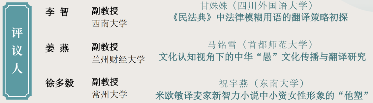 第一位主讲人甘姝姝,来自四川外国语大学44118太阳成tyc城集团,研究方向为法律外交翻译;第二位主讲人马铭雪,来自首都师范大学,研究方向为翻译与国际传播;第三位主讲人祝宇燕,来自东南大学外国语学院,主要从事文学翻译。