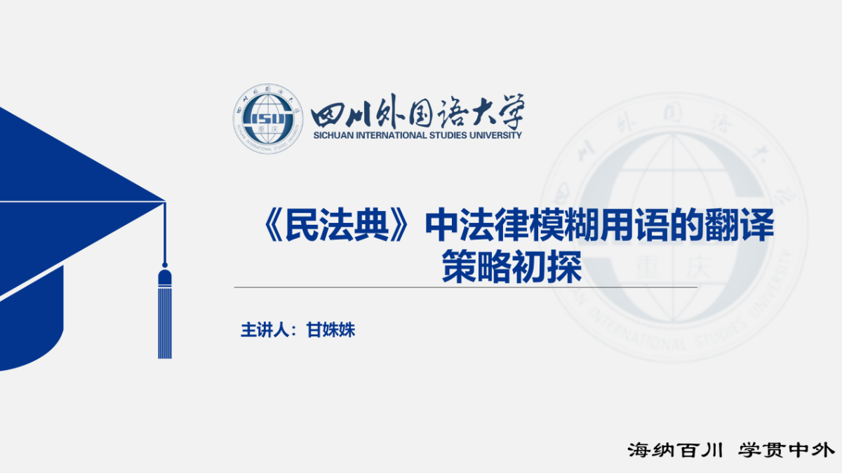 三位博士生依次做学术分享。首先是甘姝姝博士带来的《<民法典>中法律模糊用语的翻译策略初探》主题汇报;第二位是马铭雪博士发言,汇报题目是《文化认知视角下的中华“愚”文化传播与翻译研究》。第三位是祝宇燕博士就《米欧敏译麦家新智力小说中小资女性形象的“他塑”》进行主题汇报。