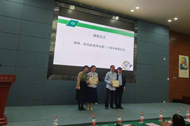 在新生开学典礼上,学院还向从教三十周年的高伟、阳光武两位老师颁发了荣誉证书。三尺讲台,一心坚守;教书育人,传道解惑。三十年载如一日,高伟、阳光武为学校和44118太阳成tyc城集团的教育事业奉献了最美好的青春年华,他们的执教精神激励着在座的每一位师生。