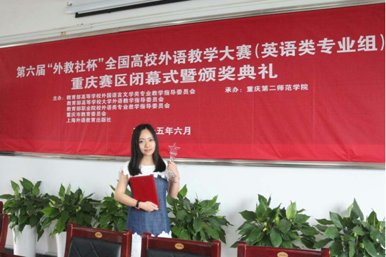 黄钰洁老师以总分第一的成绩夺得此次教学大赛(英语专业组)重庆赛区特等奖,展现了我校青年教师过硬的专业基本功、全面的综合素质和较强的应变能力。黄钰洁老师将于今年十一月代表重庆赛区参加在上海举办的总决赛,预祝她能够取得更加优异的成绩。