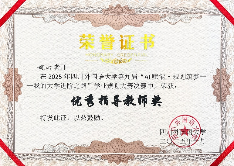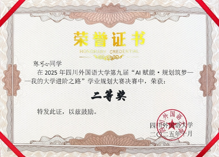 2025年10月21日,四川外国语大学第九届“AI赋能·规划筑梦——我的大学进阶之路”学业规划大赛圆满落幕。我院2024级本科生陈可心同学凭借出色的表现,在决赛中荣获二等奖,指导教师姚沁荣获“优秀指导教师奖”。