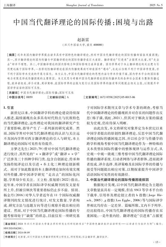 近日,我院2023级硕士研究生赵新雷在《上海翻译》(CSSCI来源期刊)2025年第五期发表论文《中国当代翻译理论的国际传播:困境与出路》。