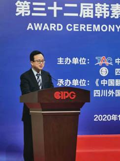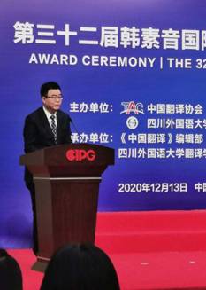 董洪川在发言中,首先感谢了中国翻译协会和外文局新老领导、社会各界、兄弟院校和评审专家在此次大赛中给予学校的鼎力支持和热心指导。他指出,在今天的新时代背景下,在国家大力倡导中华文化走出去和构建人类命运共同体的当下语境中,人们对于翻译事业的重要性的认识比历史上任何一个时期都更深刻。作为韩素音国际翻译大赛的主办方之一,也作为承办单位,能为祖国的翻译事业和翻译人才选拔做一点力所能及的事情,川外倍感骄傲。他简要介绍了学校和翻译学科的发展历史,并对参赛选手和获奖者表达了问候和祝贺,称他们是中外文化交流的“摆渡人”、是祖国翻译事业的未来和希望。