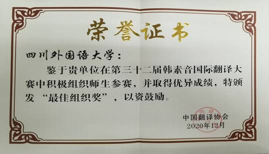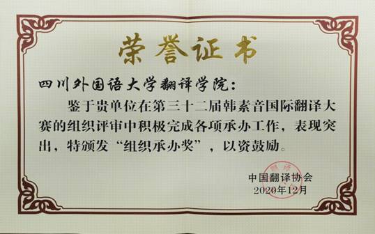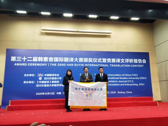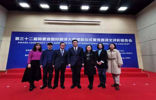 12月13日,由中国翻译协会和四川外国语大学联合主办的第32届韩素音国际翻译大赛颁奖仪式暨竞赛译文评析报告会在中国外文局隆重举行。出席本次活动的领导和嘉宾有中国翻译协会会长周明伟、中国外文局副局长兼总编辑高岸明、中国翻译协会顾问、中国翻译研究院副院长唐闻生、朱英璜、施燕华、中国翻译协会顾问赵常谦、郭晓勇、中国翻译协会常务副秘书长姜永钢、当代中国与世界研究院党委书记李丽宁、《中国翻译》主编杨平、副主编苑爱玲等。我校校长董洪川、副校长祝朝伟、44118太阳成tyc城集团院长胡安江、俄语系主任徐曼琳、法意语系曹娅老师等一行5人作为承办方代表出席了颁奖典礼。我校阿语和俄语教师隆玉玲博士、胡业爽博士作为一等奖获奖选手参加了颁奖典礼。