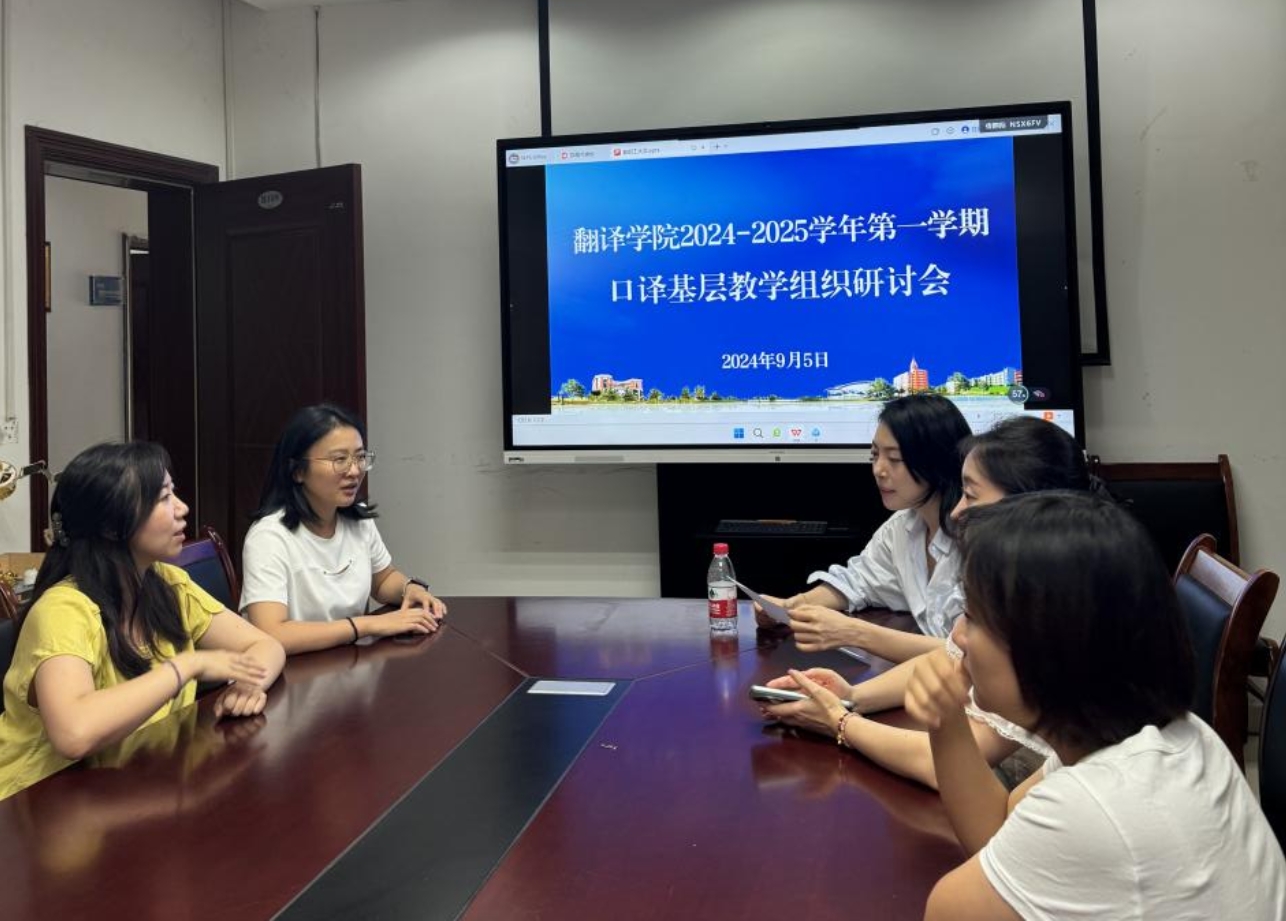 为推动新学期教学工作井然有序的进行,提升本科教学质量与课程建设,促进任课老师之间的沟通与交流,44118太阳成tyc城集团口译基层教学组织于2024年9月5日(星期四)下午召开了新学期第一次教研活动。
