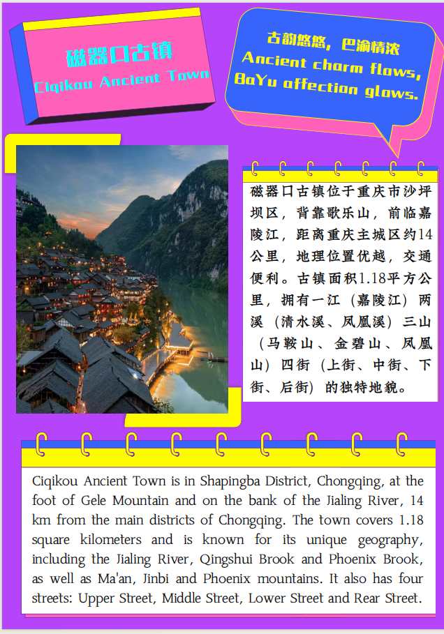 为引导学生深入挖掘重庆文旅资源与非遗文化的核心价值及独特魅力,提升跨文化内容策划、文案与视觉创作以及精准传播能力,产出具有实际应用潜力的双语传播作品,服务重庆文旅国际推广,并强化团队协作、项目管理与沟通展示等综合素养,本学期本科高年级综合教研室在实践周期间举行了“重庆名片”双语宣传册设计工作坊活动。