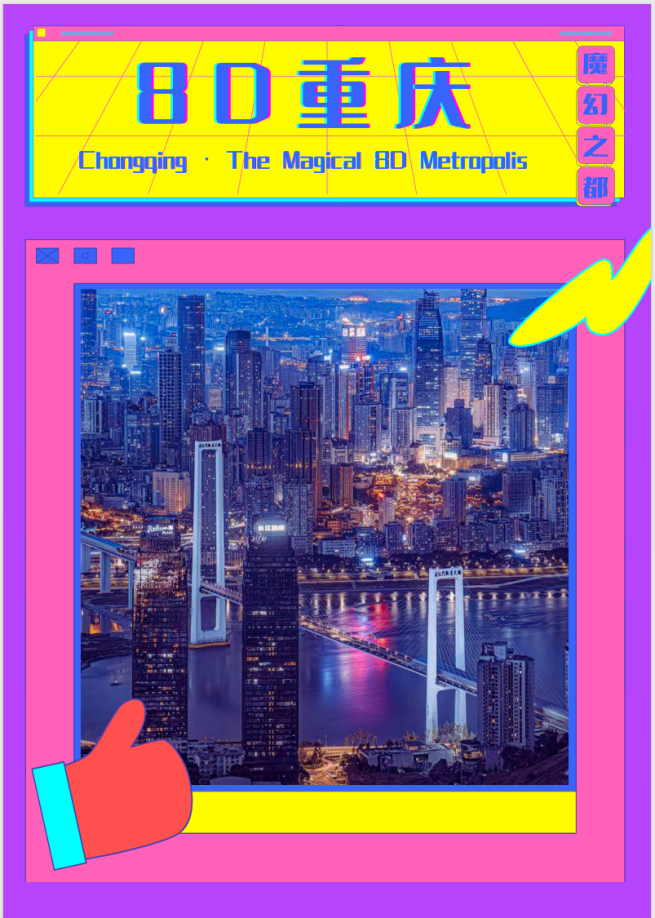 2022级各班参赛选手在班导师指导下,以“8D魔幻交通”“洪崖洞时空叠影”“舌尖上的火辣重庆”“穿越洪崖洞之夜”“重庆名片”“万州烤鱼”等为主题,以多元视角展示了山城之“魂”。这些作品或以历史之眼感知磁器口的悠悠古韵与巴渝情浓,或以实用攻略织就九宫格游玩动线、或以色香味叙事唤起地方美食的麻辣鲜香、或以符号解构呈现网红地标与立体交通交织的魔幻意象。