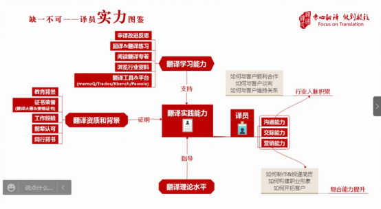 谢亮亮老师聚焦了成为合格译员的职业路径。他总结说,市场需要的是同时拥有扎实语言能力和丰富经验的译员。扎实的语言能力依托于校内的努力学习,而丰富的经验则要求同学们把握各类实习实训机会,全面发展努力成为一名优秀的译员。