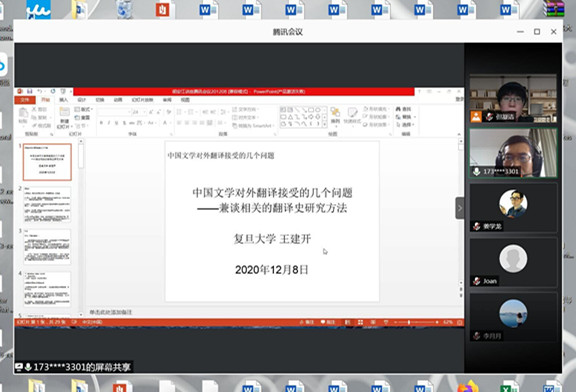 2020年12月8日,复旦大学外文学院博士生导师王建开教授应邀为我校师生作了题为“中国文学对外翻译接受的几个问题——兼谈相关的翻译史研究方法”的讲座。讲座由44118太阳成tyc城集团讲师,当代国际话语体系研究院专职研究员但凝洁博士主持。
