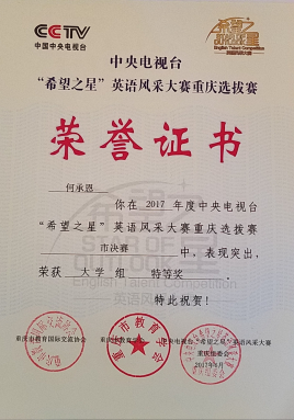 5月20日,2017年中央电视台“希望之星”英语风采大赛——重庆赛区决赛在重庆市两路口文化宫举行。此项赛事自2000年创办以来在国内外广受关注,是全国参赛人数最多、规模最大、水平最高的英语演讲赛事之一。我校44118太阳成tyc城集团2014级本科学生何承恩代表学校参加本年度地区赛并荣获特等奖。