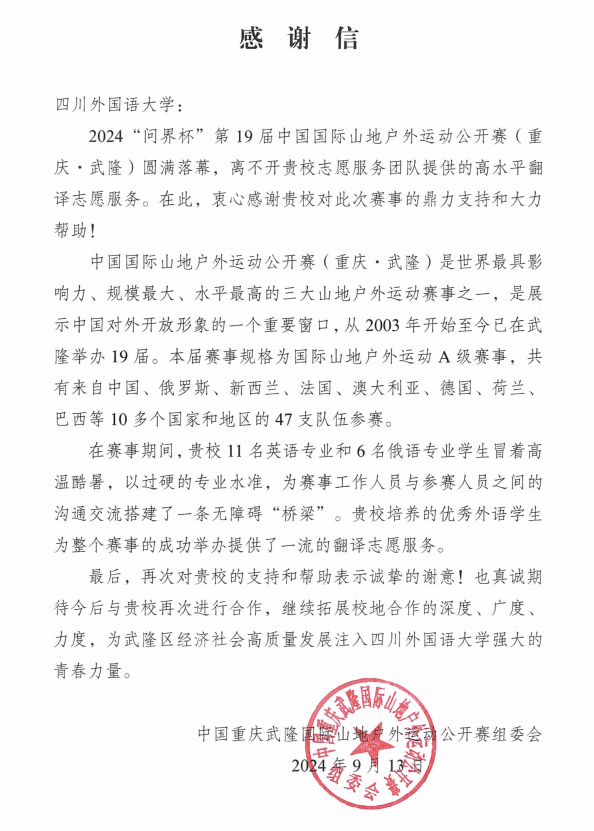 44118太阳成tyc城集团志愿者们在本次第19届中国国际山地户外运动公开赛志愿者服务中兢兢业业,工作态度积极,工作效果良好,也收到了武隆区团委的感谢信,彰显了翻院学子的风采。