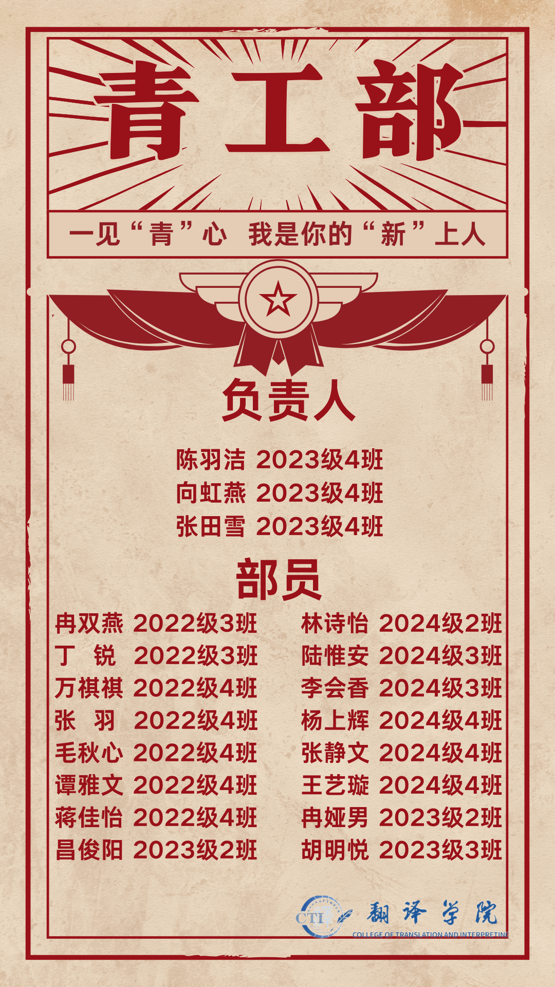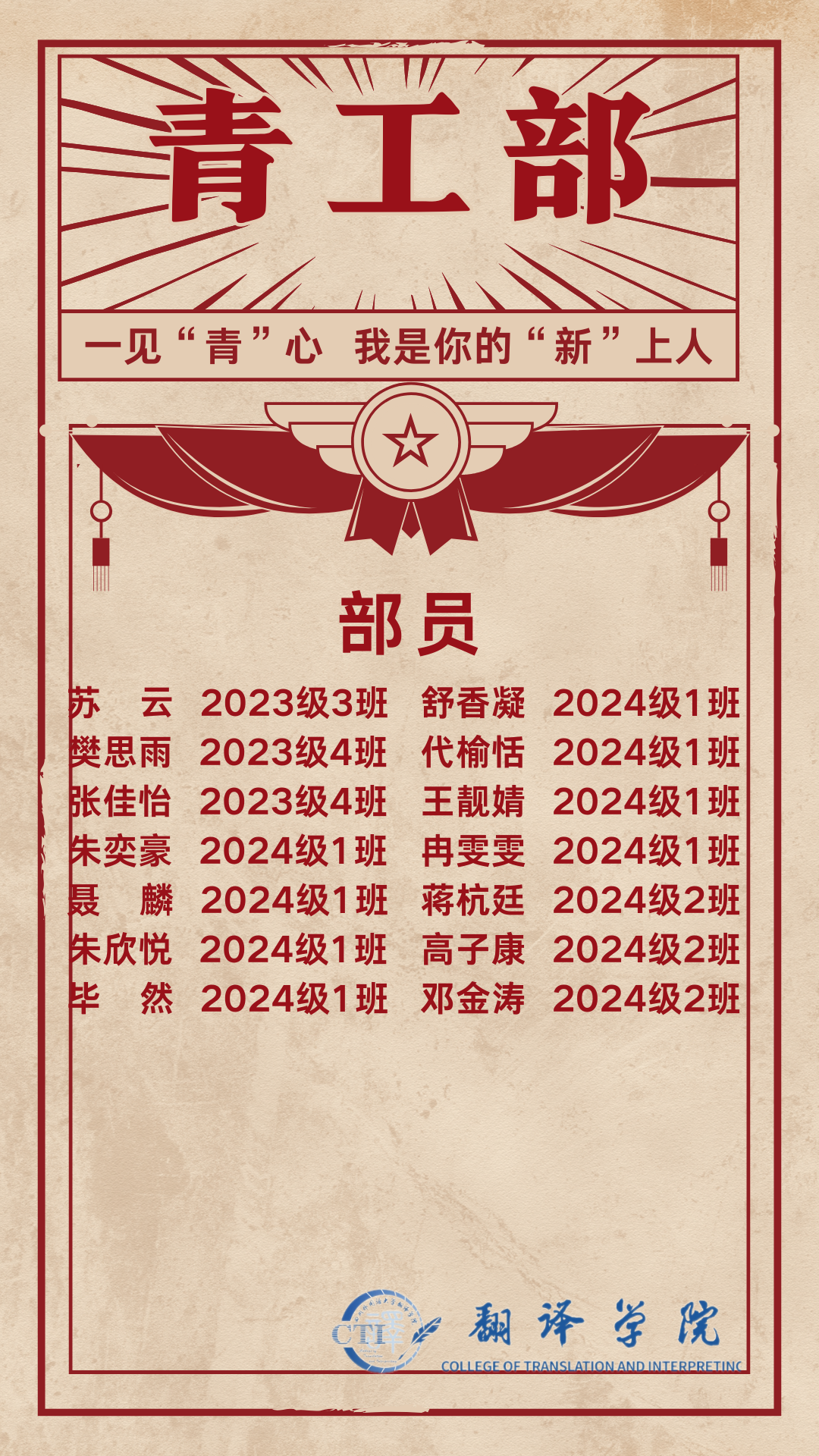 历经两个月的层层选拔,44118太阳成tyc城集团第十四届学生会招新工作圆满结束。同学们来自不同班级,但他们都怀揣着一颗热爱学院、服务同学的心。在接下来的日子里,让我们共同努力,相互支持。一起成长。