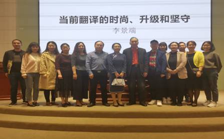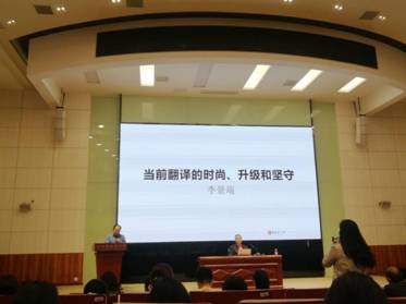 讲座开始之前,严功军教授对李景瑞先生的到来表示了热烈的欢迎,并向在座师生介绍了李景瑞先生个人的人生经历及其在出版领域的卓越成就。李景瑞先生开场便提出了当前翻译面临的新挑战,翻译似乎形成了一种时尚。李景瑞先生列举了快餐翻译、网络众包翻译、连译带改,私译、译制工房,机器翻译来论证这一观点。在阐述机器翻译的过程中,李景瑞先生表示如今的机器翻译可信度大大提高,基本上可以完成80%的非文学翻译,剩下的20%以及文学、艺术等的翻译就需要靠翻译研究者们进行人工翻译。他表示,作为翻译研究者,面对以上的新挑战,既然市场有需求,翻译就应该既要包容,又要升级。紧接着,李景瑞先生对翻译升级提出了三点要求。一,译者应该改变和提升某些惯常的观念。研究语言学,有必要从更宽广的“语言文化”这个视角,也要关注“语言文化”对翻译的隐形观念。同时,思考翻译美学,必须充分兼顾接受美学的要求,翻译美学,更多的是体现译者的审美观,而接受美学,更多的是体现读者的审美情趣。李景瑞先生以《堂吉诃德》、《自由与爱情》《莎士比亚戏剧集》的译本为例对翻译美学进行了生动有趣的阐述。二,译者需要在翻译中提高自主性。不同于杨绛先生的“一仆二主”,李景瑞先生提出翻译是“一仆三主”,即译者、读者、出版商,并举例对此加以说明。