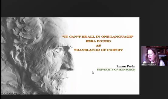 Roxana Preda博士首先介绍了美国著名诗人、翻译家和文学评论家埃兹拉·庞德(Ezra Pound)在散文和诗歌翻译方面的重要作品,并将庞德的诗歌翻译划分为两个阶段:实验阶段(1908-1923年)和成熟阶段(1923-1959年)。在实验阶段,庞德通过各种诗歌形式的探索,试图通过翻译进行诗学的创新。从1923年开始,他不再单独进行诗歌翻译,而是将所有的诗歌翻译融入他最具影响力的长诗《诗章》的创作中,唯一的例外是1954年出版的《诗经》英译本。
