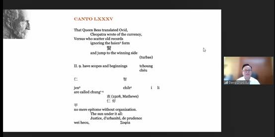 最后,RoxanaPreda博士针对庞德与儒家文化的渊源进行了以历时为线索的条分缕析,并以第13首诗章(Canto13)和第85首诗章(Canto85)为例,解析了庞德如何将对儒家经典的翻译融入到诗歌创作中,并根据自身的诗学、政治和哲学主张进行增删和改写。