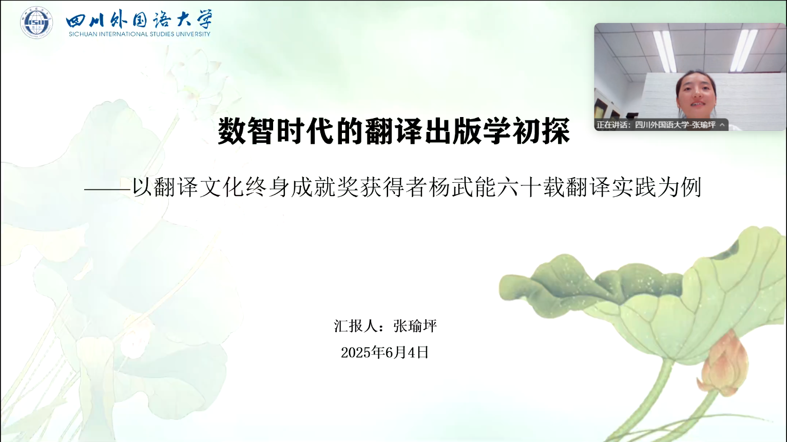 2025年6月4日,翻译协会邀请我院2023级翻译学博士研究生张瑜坪开设讲座,主题为“数智时代的翻译出版学初探——以翻译文化终身成就奖获得者杨武能六十载翻译实践为例”。翻译协会会长赵新雷主持讲座。