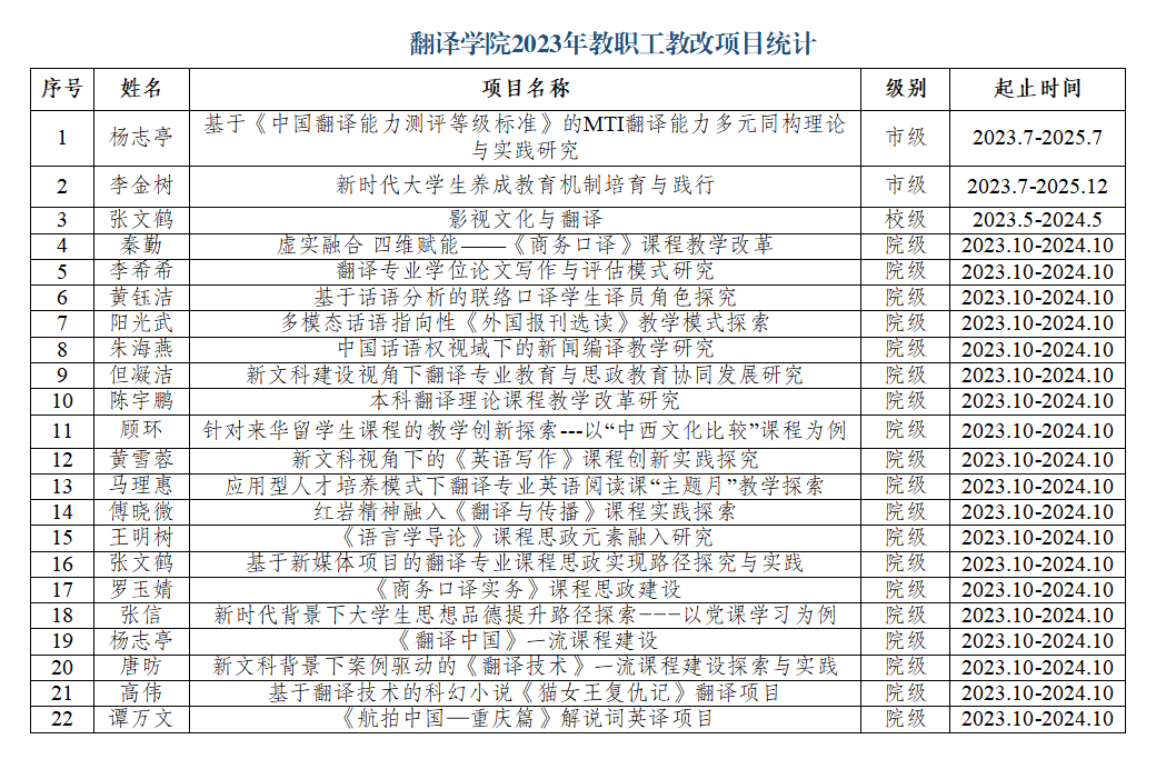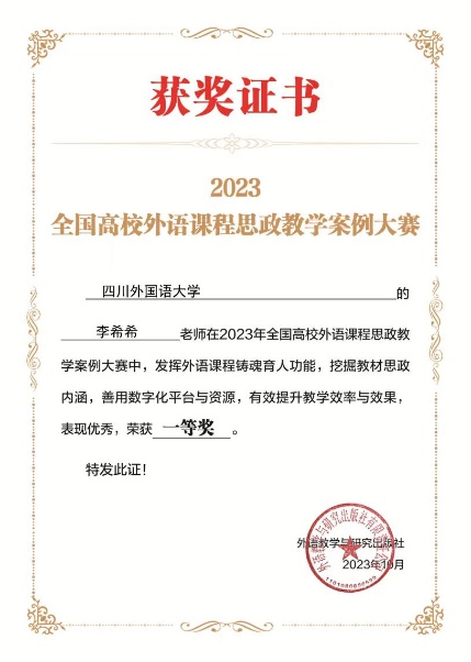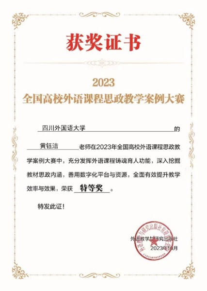 新增学科办立项2项、校级教材建设1项。获批市级教改项目2项,院级教改立项19项。学院教师获校级教学成果奖二等奖2项。黄钰洁老师和李希希老师在2023年全国高校外语课程思政教学案例大赛中,分别荣获特等奖和一等奖。顾环老师和罗玉婧老师在重庆市2023年本科高校微课教学大赛中,分别荣获市级三等奖和优秀组织工作奖。