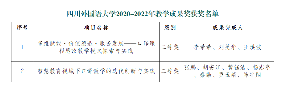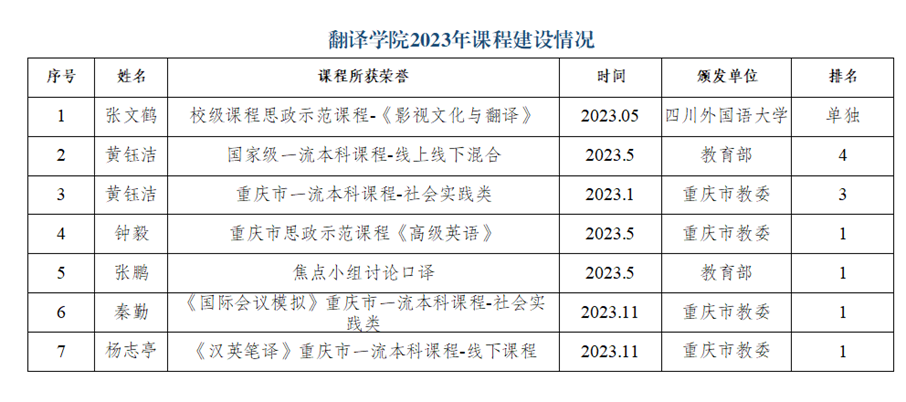 张鹏教授负责的课程《焦点小组讨论口译》获批国家级一流本科课程。学院新增重庆市课程思政示范课程1门,重庆市一流本科课程1门、重庆市社会实践类一流本科课程1门,新增校级课程思政示范课程1门。