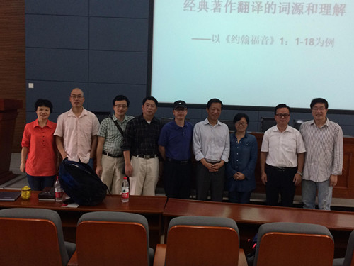 谢教授的讲座以《约翰福音》的第1-18节为例,从英文版中的核心词汇“GOD”、“WORD”等词汇追溯至古希腊的原文本本义,进行了深入浅出条分缕析的分析和阐述,并与台下的师生进行了交流和互动。从讲座中不能看出,谢教授的语言功底之深厚,涉猎的知识面之广和学术研究态度之严谨,其幽默风趣的讲座风格更让我们对这位大家留下了很深的印象。讲座的主题明确,举例丰富,涉猎的学科内容较多,如:翻译学、宗教学、哲学等,但教授的讲解深浅适度,让大家享受了一场充满哲学思辨的饕餮盛宴。接下来,现场的师生和谢教授进行了互动,气氛十分活跃。李龙泉教授做了简要总结,上午的讲座在一片热烈的掌声中画下圆满的句号。