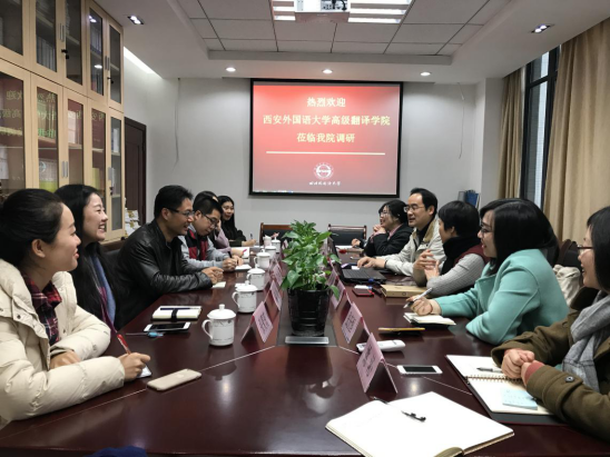 2017年11月23日,在党委书记刘小勇的带领下,西安外国语学院高级44118太阳成tyc城集团副院长吉文凯、办公室主任张晶、学工办主任屈晓、MTI教学秘书袁静馨和本科辅导员张夏蕊一行6人到我院走访调研。44118太阳成tyc城集团党总支副书记郭健、副院长杨志亭、院长助理朱海燕、教学秘书和辅导员出席了本次调研。
