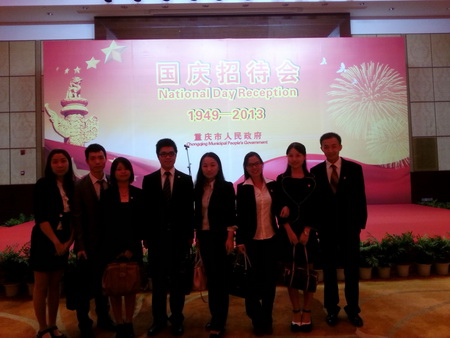 9月29日,重庆市政府在南坪凯宾斯基酒店召开了国庆招待会,隆重庆祝中华人民共和国成立64周年华诞。市领导杜黎明、刘强、张玲,在渝各领馆官员及夫人, 外籍专家学者, 外国企业代表和在渝港澳台人士、华侨华人代表共250余人参加了招待会。