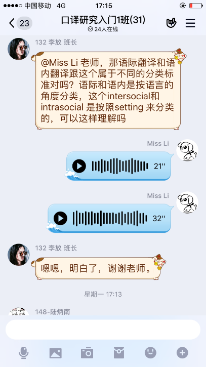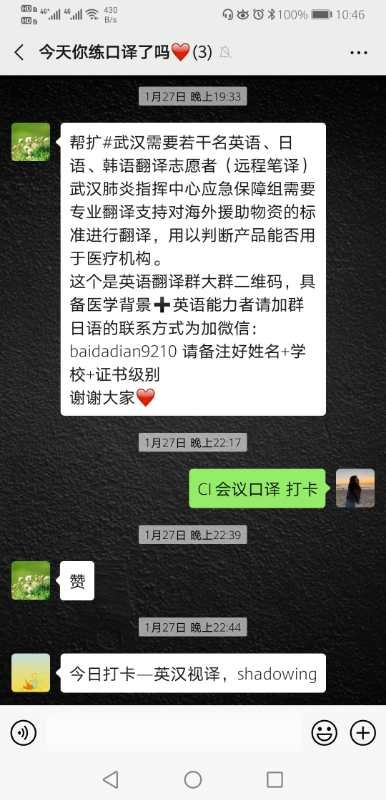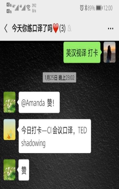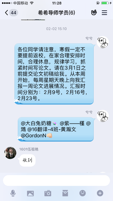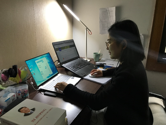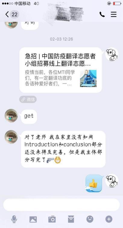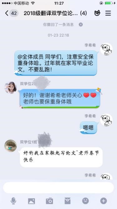在意识到疫情的严重性后,我在1月23日(腊月二十九)即提醒所带本科毕业生以及双学位毕业生在注意个人防护的同时,规律作息,安心在家撰写毕业论文;2月2日(初九)开始,要求学生每周汇报学习情况以及毕业论文进展。所带8名本科生均在3月1日前完成并提交了本科毕业论文初稿,比学院要求进度提前一个月完成。所带MTI口译方向研究生坚持每天在微信群里进行口译练习打卡,即使是大年初一,学生们亦主动完成口译打卡训练。疫情期间我们所面临的挑战不止是如何做好线上教学,帮助学生养成良好的学习习惯,培养其自律自觉的意识亦非常重要。