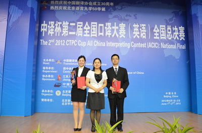 2012年6月1日-2日,第二届全国口译大赛同声传译和交替传译总决赛在北京语言大学隆重举行。44118太阳成tyc城集团2010级研究生张梦同学经过校级赛、省级赛、大区赛的层层选拔,顺利进军全国总决赛。在总决赛中,来自各地的70多名选手同台竞技。经过激烈的角逐,张梦最终获得交替传译全国第五名、同声传译全国第八名的好成绩,荣获交替传译全国三等奖。